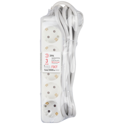 Удлинитель электрический Эра U-5e-3m-3x1,5 с заземлением, 5 розеток, 3м ПВС 3x1,5мм2. Для мощных приборов. Рассчитан на максимальную мощность 16А/3500. Удлинитель Эра станет Вашим надежным помощником, если Ваши любимые электроприборы находятся далеко от розеток.