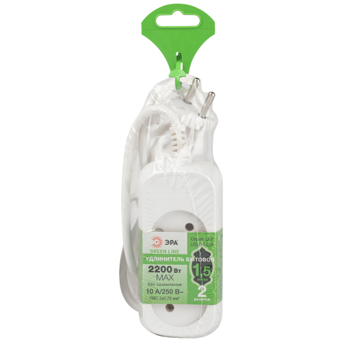 Удлинитель электрический Эра GREENLINE UDL-10-215 без заземления, на 2 розетки, провод 1,5м ПВС 2x0,75мм2. Рассчитан на максимальную мощность 10А/2200 Вт. Удлинитель станет Вашим надежным помощником, если любимые электроприборы находятся далеко от розеток. Корпус выполнен из ударопрочного и негорючего пластика (полипропилен). Модель удлинителя на 10А позволяет подключать бытовые приборы общей нагрузкой до 2200Вт.