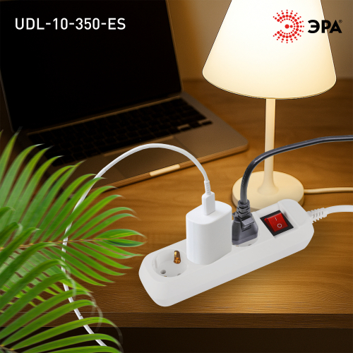 Удлинитель электрический Эра GREENLINE UDL-10-350-ES с заземлением, с выключателем, 3 розетки, провод 5м ПВС 3x0,75мм2. Рассчитан на максимальную мощность 10А/2200 Вт. Удлинитель станет Вашим надежным помощником, если любимые электроприборы находятся далеко от розеток. Корпус выполнен из ударопрочного и негорючего пластика (полипропилен). Вилка обеспечена кольцом для удобного извлечения ее из розетки. Модель удлинителя на 10А позволяет подключить бытовые приборы общей нагрузкой до 2200Вт.