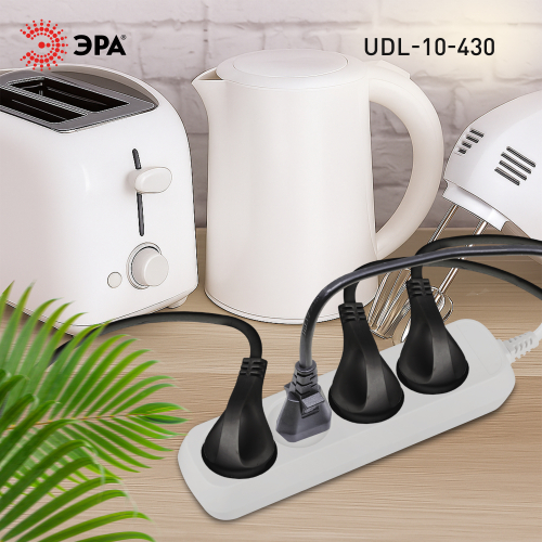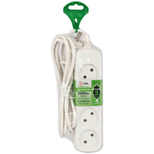 Удлинитель электрический Эра GREENLINE UDL-10-430 без заземления, на 4 розетки, провод 3м ПВС 2x0,75мм2. Рассчитан на максимальную мощность 10А/2200 Вт. Удлинитель станет Вашим надежным помощником, если любимые электроприборы находятся далеко от розеток. Корпус выполнен из ударопрочного и негорючего пластика (полипропилен). Модель удлинителя на 10А позволяет подключать бытовые приборы общей нагрузкой до 2200Вт.