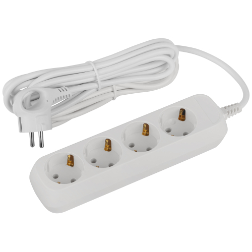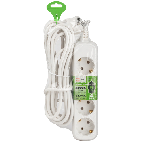 Удлинитель электрический Эра GREENLINE UDL-10-450-E с заземлением, на 4 розетки, провод 5м ПВС 3x0,75мм2. Рассчитан на максимальную мощность 10А/2200 Вт. Удлинитель станет Вашим надежным помощником, если любимые электроприборы находятся далеко от розеток. Корпус выполнен из ударопрочного и негорючего пластика (полипропилен). Вилка обеспечена кольцом для удобного извлечения ее из розетки. Модель удлинителя на 10А позволяет подключить бытовые приборы общей нагрузкой до 2200Вт.