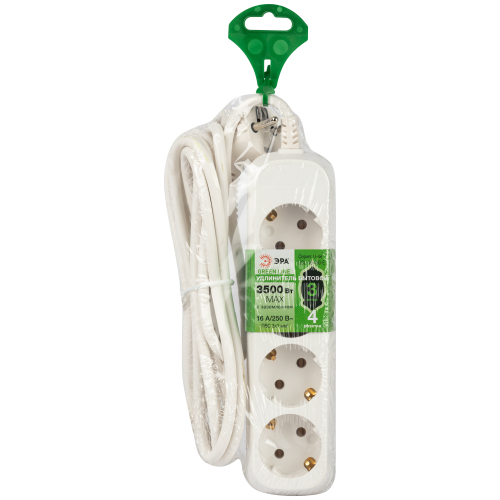 Удлинитель электрический Эра GREENLINE UDL-16-430-E с заземлением, на 4 розетки, провод 3м ПВС 3x1мм2. Рассчитан на максимальную мощность 16А/3500 Вт. Удлинитель станет Вашим надежным помощником, если любимые электроприборы находятся далеко от розеток. Корпус выполнен из ударопрочного и негорючего пластика (полипропилен). Вилка обеспечена кольцом для удобного извлечения ее из розетки. Модель удлинителя на 16А позволяет подключить бытовые приборы общей нагрузкой до 3500Вт.
