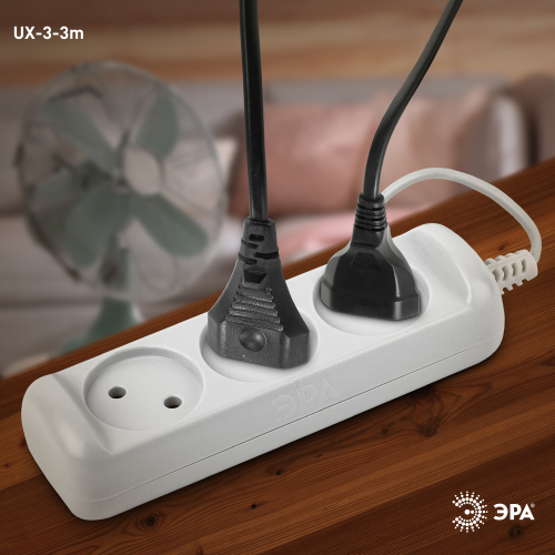 Бытовой удлинитель ЭРА UX-3-3m на 3 розетки, без заземления, с удлинённым проводом ШВВП 3 метра. Рассчитан для подключения простых бытовых приборов стандартной мощности. Максимальная нагрузка - 6 A/ 1300 Вт. Базовый белый цвет, аккуратный дизайн с закруглёнными углами. Для комфорта и безопасности гнёзда слегка "утоплены" в корпус. Изготовлен из надёжного полипропилена со специальными антипиренами, препятствующими горению.