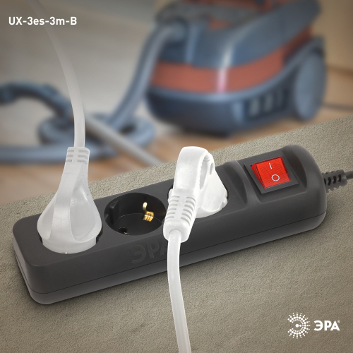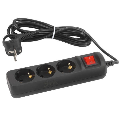 Удлинитель электрический Эра UX-3es-3m-B с заземлением, с выключателем, черный, 3 розетки. Провод ПВС, 3x0,75мм2, 3 м. Рассчитан на максимальную мощность 10А/2200 Вт. Удлинитель Эра станет Вашим надежным помощником, если Ваши любимые электроприборы находятся далеко от розеток. Провод в удлинителях Эра сделан из 100% меди, что делает его абсолютно пожаробезопасным. Корпус выполнен из ударопрочного и негорючего пластика (полипропилен). Вилка обеспечена кольцом для удобного извлечения ее из розетки. Модель удлинителя на 10А позволяет подключить бытовые приборы общей нагрузкой до 2200Вт. Дизайн удлинителя разработан в России командой Эра Style.