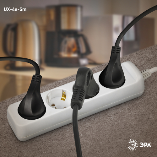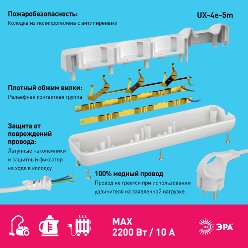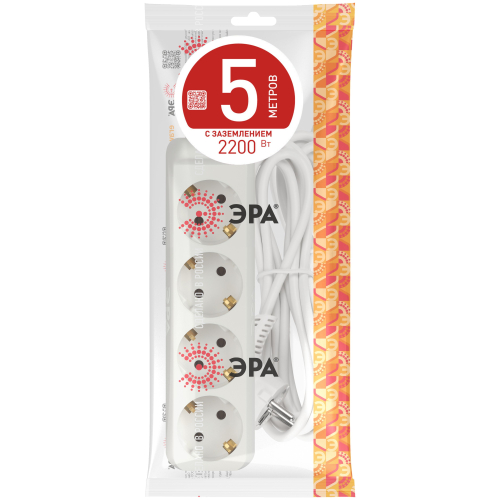 Удлинитель электрический Эра UX-4e-5m с заземлением, ПВС, 3x0,75мм2, 4 розетки, 5 м. Рассчитан на максимальную мощность 10А/2200 Вт. Удлинитель Эра станет Вашим надежным помощником, если Ваши любимые электроприборы находятся далеко от розеток. Провод в удлинителях Эра сделан из 100% меди, что делает его абсолютно пожаробезопасным. Корпус выполнен из ударопрочного и негорючего пластика (полипропилен). Вилка обеспечена кольцом для удобного извлечения ее из розетки. Модель удлинителя на 10А позволяет подключить бытовые приборы общей нагрузкой до 2200Вт. Дизайн удлинителя разработан в России командой Эра Style.