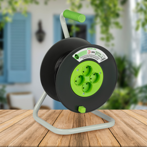 Удлинитель силовой ЭРА GREEN LINE на пластиковой катушке KAT-2x0.75-20m, 4 розетки без заземления. Провод ПВС 2х0,75мм2, 20м. Мощность 6А/1300Вт. Используется для работы на строительных площадках или дачных участках. Удобен при работе с приборами, находящимися удаленно от стационарной розетки. Например, газонокосилки, электрические, пилы, триммеры или электродрели. Рама катушки сделана из высокопрочной стали, а пластиковой корпус катушки выполнен с применением негорючих добавок.