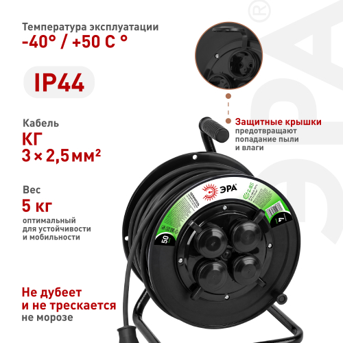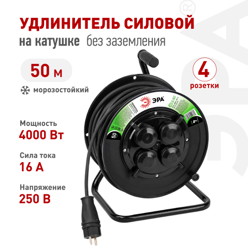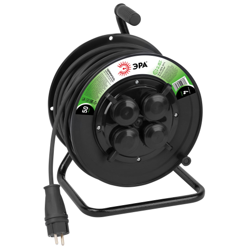 Удлинитель силовой ЭРА GREEN LINE KAT-KG-2x2.5-50m-IP44 на пластиковой катушке без заземления, 4 розетки с защитными крышками- IP44, провод 50м КГ 2х2,5мм2. Мощность 16А/4000Вт МАХ. Используется для работы на строительных площадках или дачных участках. Удобен при работе с приборами находящимися удаленно от стационарной розетки. Например, газонокосилки, электрические пилы, триммеры или электродрели.