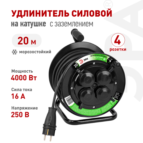 Удлинитель силовой ЭРА GREEN LINE KAT-KG-3x2.5-20m-IP44 на пластиковой мини катушке с заземлением, 4 розетки с защитными крышками- IP44, провод 20м КГ 3х2,5мм2. Мощность 16А/4000Вт МАХ. Используется для работы на строительных площадках или дачных участках. Удобен при работе с приборами находящимися удаленно от стационарной розетки. Например, газонокосилки, электрические пилы, триммеры или электродрели.