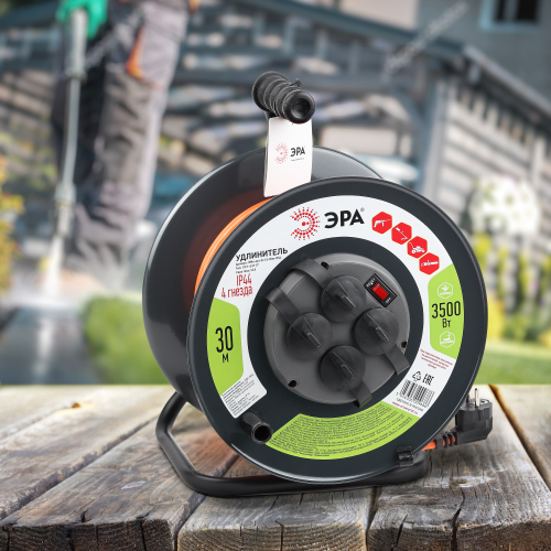 Удлинитель силовой на металлической катушке ЭРА RMx-4es-3x1.5-30m-IP44 с заземлением, с выключателем, ПВС 3x1,5м2, 4 розетки, 30м, степень защиты IP44. Мощность 16А/3500Вт. Используется для работы на строительных площадках или дачных участках. Удобен при работе с приборами находящимися удаленно от стационарной розетки. Например, газонокосилки, электрические, пилы, триммеры или электродрели. Провод в удлинителях Эра сделан из 100% меди, что делает его абсолютно пожаробезопасным. Рама удлинителя сделана из высокопрочной стали.