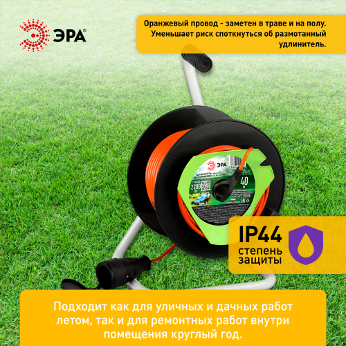 Удлинитель силовой на пластиковой катушке ЭРА RP-1-2x1-40m без заземления, 1 розетка, провод ПВС 2х1м2, 40 м. Мощность 10А/2200Вт. Степень защиты IP44. Используется для работы на строительных площадках или дачных участках. Удобен при работе с приборами, находящимися удаленно от стационарной розетки. Например, газонокосилки, электрические, пилы, триммеры или электродрели. Провод в удлинителях Эра сделан из 100% меди, что делает его абсолютно пожаробезопасным. Рама удлинителя сделана из высокопрочной стали, а пластиковой корпус выполнен с применением негорючих добавок.