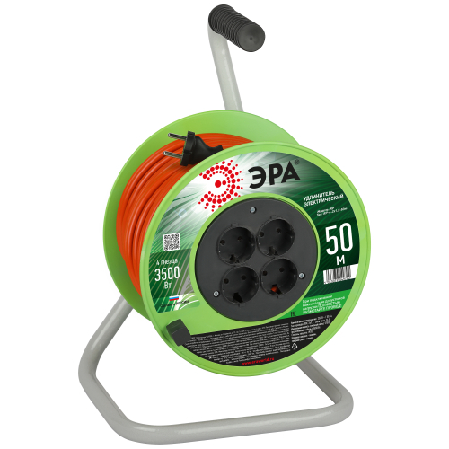 Удлинитель силовой на пластиковой катушке ЭРА RP-4-2x1.5-50m без заземления, 4 розетки, провод ПВС 2х1,5м2, 50 м. Мощность 16А/3500Вт. Используется для работы на строительных площадках или дачных участках. Удобен при работе с приборами, находящимися удаленно от стационарной розетки. Например, газонокосилки, электрические, пилы, триммеры или электродрели. Провод в удлинителях Эра сделан из 100% меди, что делает его абсолютно пожаробезопасным. Рама удлинителя сделана из высокопрочной стали, а пластиковой корпус выполнен с применением негорючих добавок.