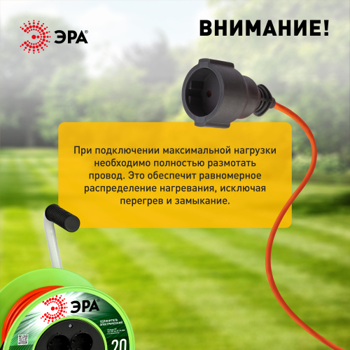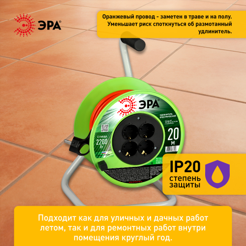 Удлинитель силовой на пластиковой катушке ЭРА RP-4e-3х1.0-20m с заземлением, 4 розетки, провод ПВС 3х1м2, 20 м. Мощность 10А/2200Вт. Используется для работы на строительных площадках или дачных участках. Удобен при работе с приборами, находящимися удаленно от стационарной розетки. Например, газонокосилки, электрические, пилы, триммеры или электродрели. Провод в удлинителях Эра сделан из 100% меди, что делает его абсолютно пожаробезопасным. Рама удлинителя сделана из высокопрочной стали, а пластиковой корпус выполнен с применением негорючих добавок.