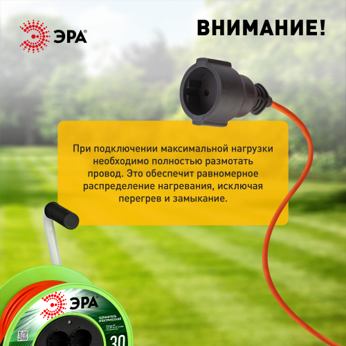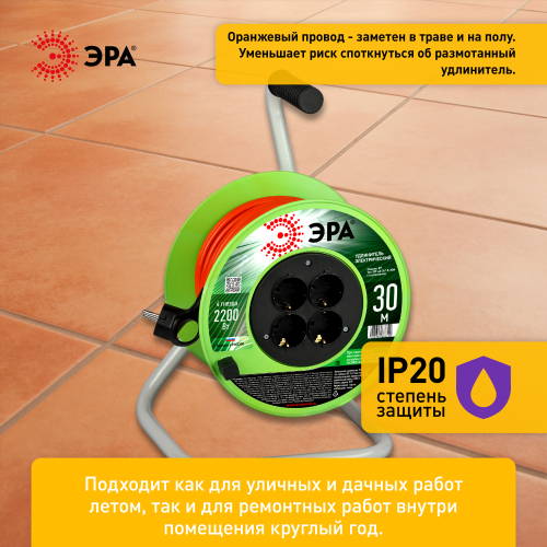 Удлинитель силовой на пластиковой катушке ЭРА RP-4e-3х1.0-30m с заземлением, 4 розетки, провод ПВС 3х1м2, 30 м. Мощность 10А/2200Вт. Используется для работы на строительных площадках или дачных участках. Удобен при работе с приборами, находящимися удаленно от стационарной розетки. Например, газонокосилки, электрические, пилы, триммеры или электродрели. Провод в удлинителях Эра сделан из 100% меди, что делает его абсолютно пожаробезопасным. Рама удлинителя сделана из высокопрочной стали, а пластиковой корпус выполнен с применением негорючих добавок.