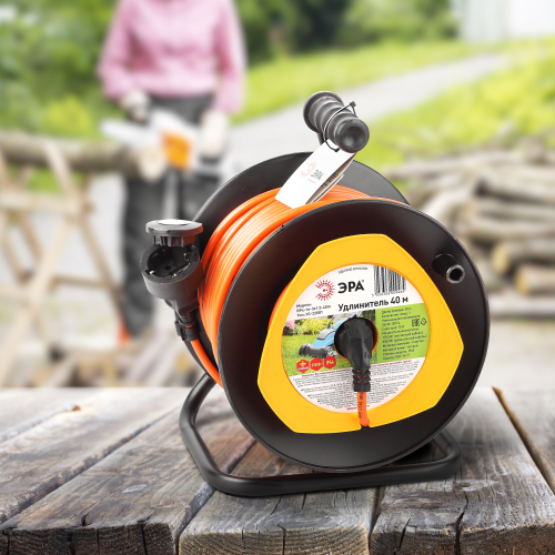 Удлинитель силовой на пластиковой катушке ЭРА RPx-1е-3x1.5-40m с заземлением, 1 розетка, провод ПВС 3х1,5м2, 40 м. Мощность 16А/3500Вт. Используется для работы на строительных площадках или дачных участках. Удобен при работе с приборами находящимися удаленно от стационарной розетки. Например, газонокосилки, электрические, пилы, триммеры или электродрели. Провод в удлинителях Эра сделан из 100% меди, что делает его абсолютно пожаробезопасным. Рама удлинителя сделана из высокопрочной стали, а пластиковой корпус выполнен с применением негорючих добавок.