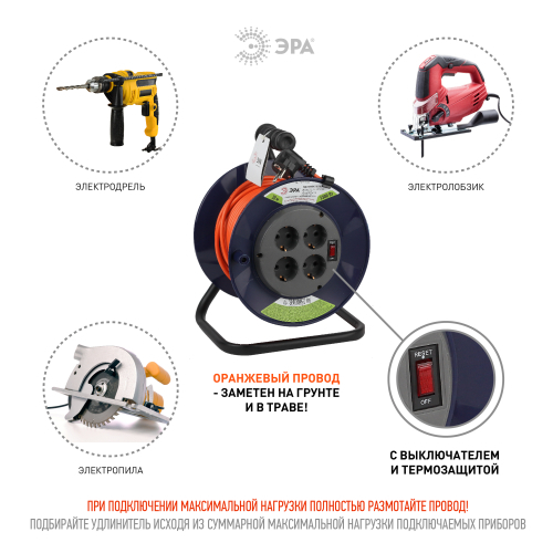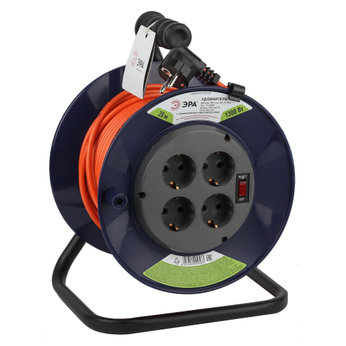 Удлинитель силовой на пластиковой катушке ЭРА RPx-4es-3х0.75-20m с заземлением, с выключателем, ПВС 3х0,75м2, 4 розетки, 20 м. Мощность 6А/1300Вт. Используется для работы на строительных площадках или дачных участках. Удобен при работе с приборами находящимися удаленно от стационарной розетки,. Например, газонокосилки, электрические, пилы, триммеры или электродрели. Провод в удлинителях Эра сделан из 100% меди, что делает его абсолютно пожаробезопасным. Рама удлинителя сделана из высокопрочной стали а пластиковой корпус выполнен с применением негорючих добавок.