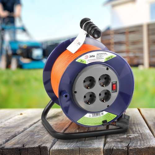 Удлинитель силовой на пластиковой катушке ЭРА RPx-4es-3x1.5-30m с заземлением, с выключателем, ПВС, 3х1.5м2, 4 розетки, 30м. Мощность 16А/3500Вт. Используется для работы на строительных площадках или дачных участках. Удобен при работе с приборами находящимися удаленно от стационарной розетки. Например газонокосилки, электрические пилы, триммеры или электродрели. Провод в удлинителях Эра сделан из 100% меди, что делает его абсолютно пожаробезопасным. Рама удлинителя сделана из высокопрочной стали, а пластиковой корпус выполнен с применением негорючих добавок. Провод ГОСТ.