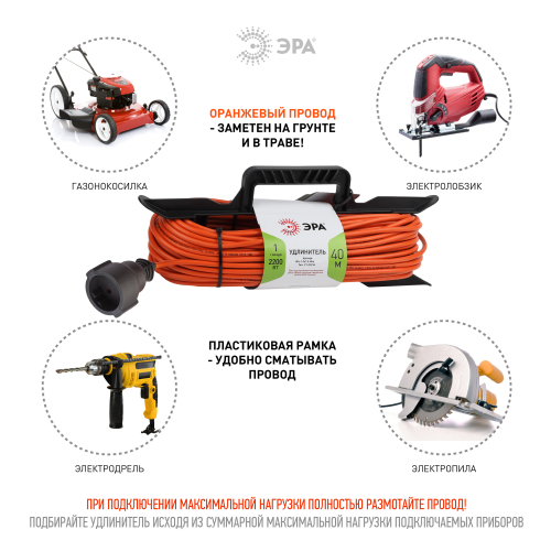 Удлинитель силовой на рамке UFx-1-2x1.0-40m без заземления, ПВС 2х1м2, 1 розетка с защитной крышкой, 40м, степень защиты IP44. Мощность 10А/2200Вт. Используется для работы на строительных площадках или дачных участках. Удобен при работе с приборами находящимися удаленно от стационарной розетки. Например, газонокосилки, электрические, пилы, триммеры или электродрели. Провод в удлинителях Эра сделан из 100% меди, что делает его абсолютно пожаробезопасным. Рама-полипропилен.