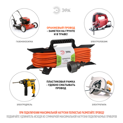 Удлинитель силовой на рамке UFx-1e-3x1.5-20m с заземлением, ПВС 3x1,5м2, 1 розетка, 20м, степень защиты IP20. Мощность 16А/3500Вт. Используется для работы на строительных площадках или дачных участках. Удобен при работе с приборами находящимися удаленно от стационарной розетки. Например, газонокосилки, электрические, пилы, триммеры или электродрели. Провод в удлинителях Эра сделан из 100% меди, что делает его абсолютно пожаробезопасным. Рама-полипропилен