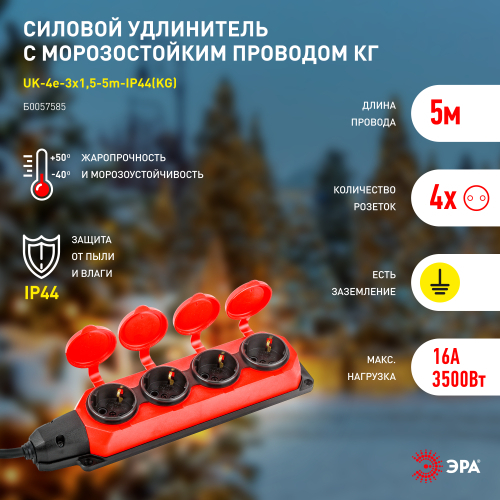 Удлинитель силовой ЭРА UK-4e-3x1,5-5m-IP44(KG) с заземлением, провод 5м, КГ 3x1,5мм2, 4 розетки, степень защиты IP44. Мощность 16А/3500Вт. Надежный, мощный удлинитель для любых работ, для подключения энергоемких электроприборов, удаленных на значительное расстояние от стационарной розетки. Корпус розеток выполнен из пыле- и влаго- защищенного материала (каучук). Характеристики провода КГ позволяют работать с удлинителем в широком диапазоне температур от -40° до +50°С, и использовать его в любое время года.