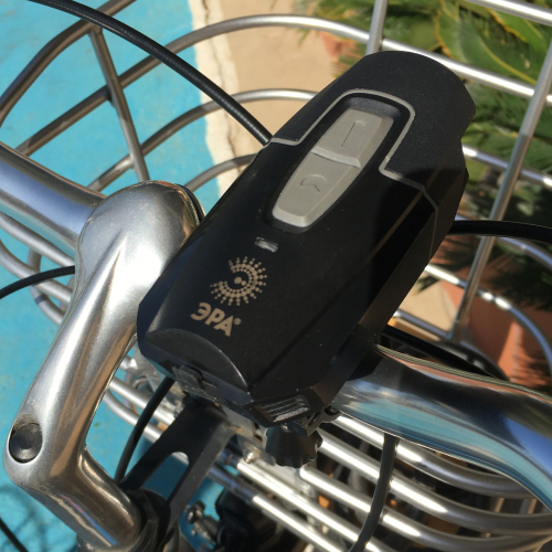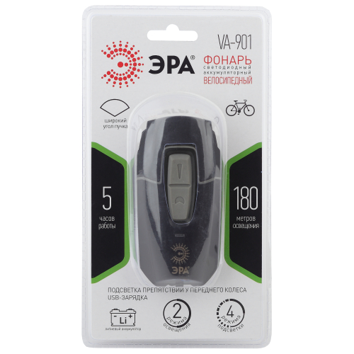 ЭРА VA-901 (арт. Б0033767) — аккумуляторный велосипедный LED-фонарь с подзарядкой через USB-порт (кабель в комплекте). Одного полного заряда хватает на 5 часов свечения благодаря ёмкому литиевому аккумулятору. Велофонарь отличает высокая дальность освещения и широкий угол светового пучка. Фонарь можно использовать в дождь (влагозащита — IP42). Светодиодный фонарь изготовлен из ударопрочного пластика, имеет надёжное крепление к велосипеду. Резиновые вкладки делают крепление универсальным для любого диаметра.