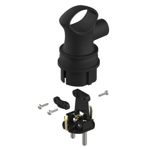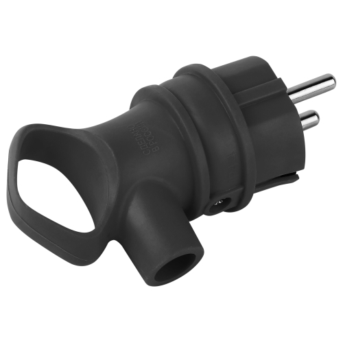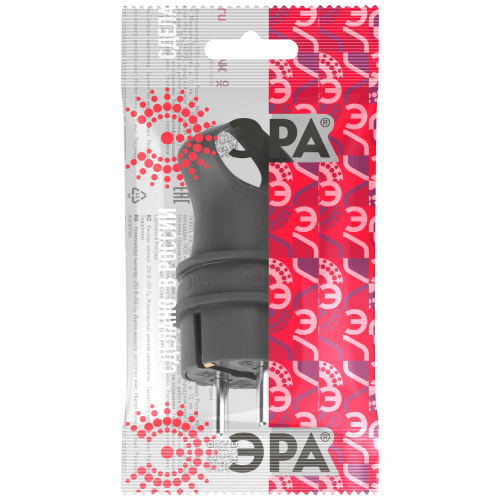 Угловая чёрная каучуковая вилка с кольцом из серии каучуковых разъёмов ЭРА российского производства. Имеется аналог в красном цвете. Рассчитана на нагрузку до 16 А и позволяет подключать кабель КГ сечением до 3x2.5 мм². Вилка с заземлением.