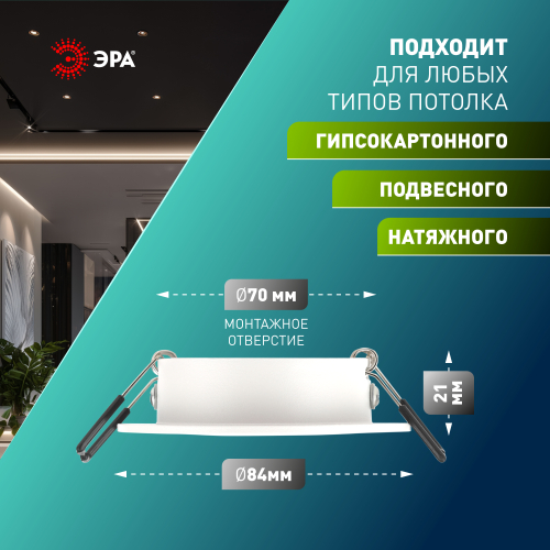 Тип светильника: Встраиваемый поворотный (подходит для монтажа в натяжные, подвесные, гипсокартонные потолки)