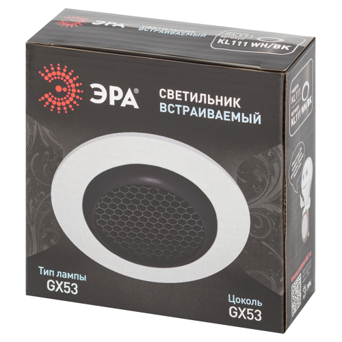 Потолочный точечный светильник ЭРА KL111 WH/BK под светодиодную лампу GX53 мощностью 15 Вт – это идеальное решение для создания комфортного и эффективного освещения в вашем доме или офисе. Этот светильник прекрасно подойдет для установки в подвесные, гипсокартонные или натяжные потолки, позволяя организовать качественное и равномерное освещение в помещении. Диаметр софита - 10,5 см, диаметр врезного отверстия - 9 см. Обратите внимание, что лампочка в комплект не входит