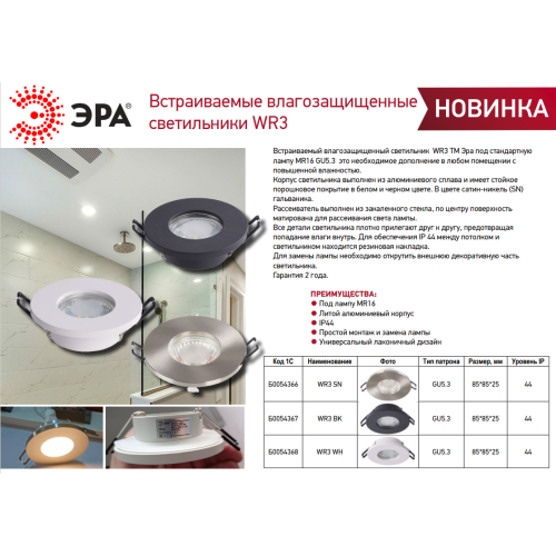 Точечный светильник WR3 SN предназначен для встраивания в потолок или стены. Он идеально подойдет для самых разных целей – с помощью таких светильников можно подчеркнуть отдельные зоны в комнатах и успешно расставить акценты. С помощью встраиваемых светильников можно подсвечивать картины, постеры или интерьерные молдинги. WR3 SN выполнен из алюминия, отличающегося своими прочностью и долговечностью. Внешний размер светильника - 85*25 миллиметров, а монтажный - 65 миллиметров. Степень защиты светильника - IP44, она позволяет размещать его во влажных помещениях, например, в ванной комнате. Для данного светильника подойдет лампа с цоколем GU5.3 мощностью до 50 Вт. Светильник цвета никель/сатин, благодаря чему его можно размещать в самых разных по стилю интерьерах: минимализм, фьюжн, модерн, прованс или скандинавский. Купив светильник Эра, вы сможете создать в своем доме атмосферу уюта и комфорта. Внимание! Лампа не входит в комплект.