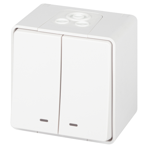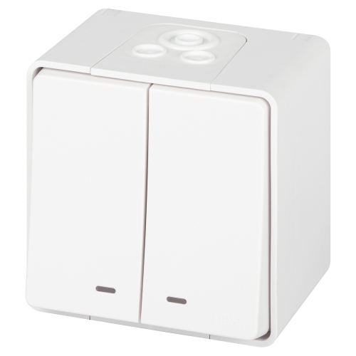 Выключатель влагозащищённый 2-клавишный с подсветкой серии Эра Эксперт накладн IP55 цвет белый 11-1505-01 открытой установки.. Номинальные характеристики 10А 250В. Выполнен из качественного поликарбоната, оснащён уникальными винтовыми клеммами ЭКСПЕРТ для максимально качественного зажима кабеля в механизме.