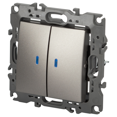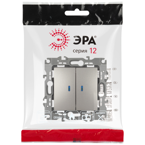 Выключатель двухклавишный с подсветкой серии Эра 12 скрытой установки механизм цвет титан 12-1105-16. Номинальные характеристики 10А 250В . Сделан из поликарбоната, оснащён автоматическими клеммами для быстрой и надёжной фиксации жил кабеля в механизме. Парные клеммы обеспечивают соединение шлейфом. Монтаж в подрозетник производится и на лапки, и на винты. Рамки приобретаются отдельно.