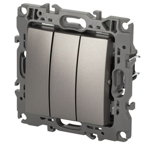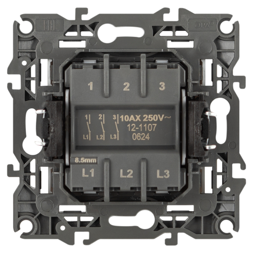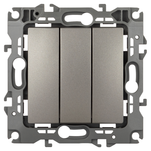 Выключатель трехклавишный серии Эра 12 скрытой установки механизм цвет титан 12-1107-16. Номинальные характеристики 10А 250В . Сделан из поликарбоната, оснащён винтовыми уникальными клеммами ЭКСПЕРТ для надёжной фиксации жил кабеля в механизме. Парные клеммы обеспечивают соединение шлейфом. Монтаж в подрозетник производится и на лапки, и на винты. Рамки приобретаются отдельно.