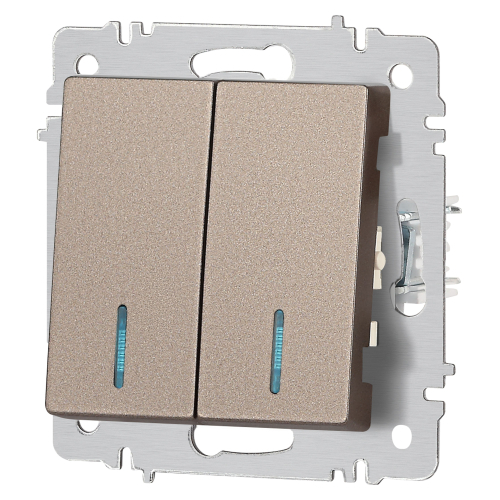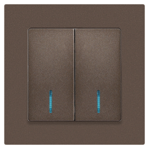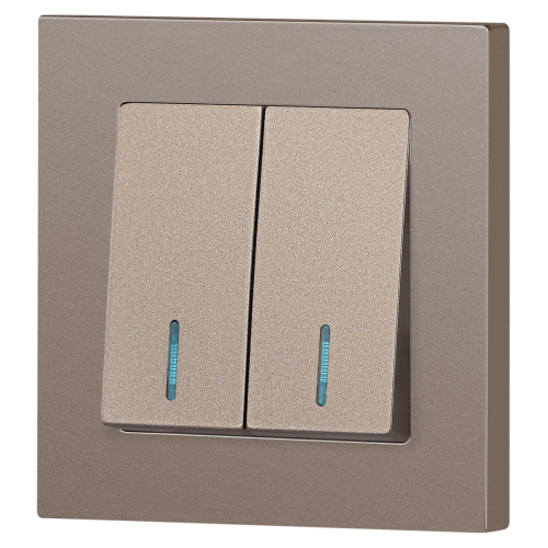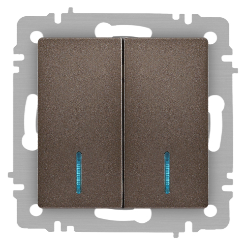 Выключатель 2-клавишный с подсветкой серии Intro Accent скрытой установки механизм цвет бронза 6-105-08. Номинальные характеристики 10А 250В. Выполнен из негорючего термопласта, оснащён винтовыми клеммами. Парные клеммы обеспечивают соединение шлейфом. Монтаж в подрозетник производится и на лапки, и на винты. Рамка приобретается отдельно. В серии представлены рамки до 5 постов: на 1 пост - 6-501-хх, на 2 поста - 6-502-хх, на 3 поста - 6-503-хх, на 6 поста - 4-504-хх, на 5 постов - 6-505-хх (где хх - цветовой код: 01 - белый, 01М - матовый белый, 02 - слоновая кость, 03 - алюминий, 04 - шампань, 05 - антрацит, 06 - перламутр, 07 - графит, 08 - бронза, 09 - титан, 10 - венге, 11 - сосна)