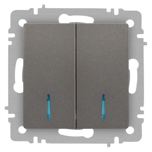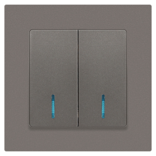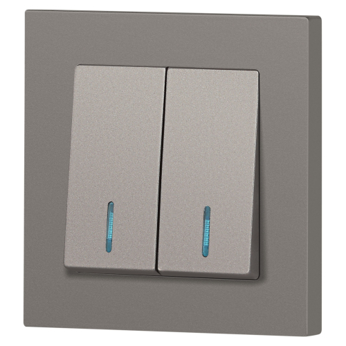 Выключатель 2-клавишный с подсветкой серии Intro Accent скрытой установки механизм цвет титан 6-105-09. Номинальные характеристики 10А 250В. Выполнен из негорючего термопласта, оснащён винтовыми клеммами. Парные клеммы обеспечивают соединение шлейфом. Монтаж в подрозетник производится и на лапки, и на винты. Рамка приобретается отдельно. В серии представлены рамки до 5 постов: на 1 пост - 6-501-хх, на 2 поста - 6-502-хх, на 3 поста - 6-503-хх, на 6 поста - 4-504-хх, на 5 постов - 6-505-хх (где хх - цветовой код: 01 - белый, 01М - матовый белый, 02 - слоновая кость, 03 - алюминий, 04 - шампань, 05 - антрацит, 06 - перламутр, 07 - графит, 08 - бронза, 09 - титан, 10 - венге, 11 - сосна)