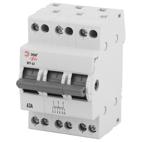 Выключатель-разъединитель трехпозиционный ВРТ-63 ЭРА PRO предназначен для коммутации смешанных активных и индуктивных нагрузок в цепях переменного тока напряжением до 400 В частотой 50 Гц. Применяется в качестве учетно-распределительного оборудования жилых и общественных зданий и сооружений, где предусматривается необходимость в оперативном отключении от сети отдельных групп электропотребителей или участков электрокоммуникации.