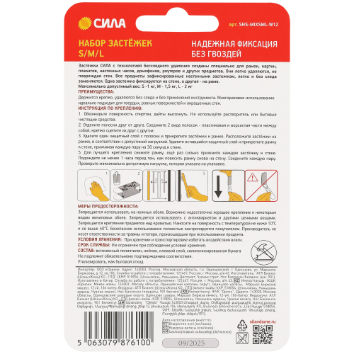 Застежки СИЛА с технологией бесследного удаления созданы специально для рамок, картин, плакатов, настенных часов, домофонов, роутеров и других предметов. Они легко удаляются, не повреждая стен. Все предметы зафиксированные настенными застежкам, легко и без следа заменяются. Одна застежка фиксируется на стене, а другая - на раме. Максимальная нагрузка: S - 1 кг на 1 пару или 4 кг на упаковку, М - 1,5 кг на 1 пару или 6 кг на упаковку, L - 2 кг на 1 пару или 8 кг на упаковку/