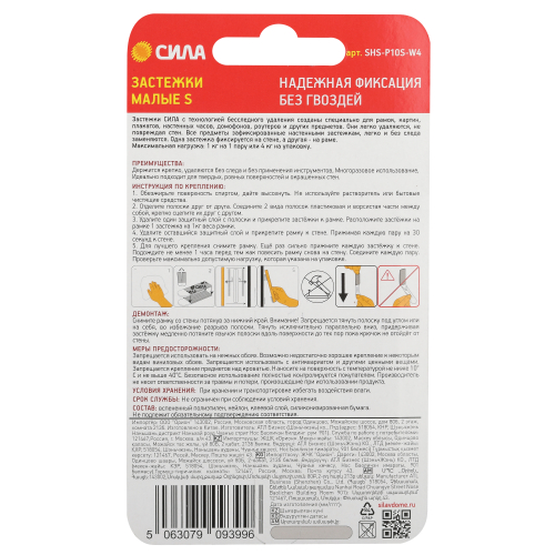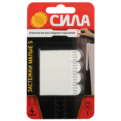 Застежки СИЛА с технологией бесследного удаления созданы специально для рамок, картин, плакатов, настенных часов, домофонов, роутеров и других предметов. Они легко удаляются, не повреждая стен. Все предметы зафиксированные настенными застежкам, легко и без следа заменяются. Одна застежка фиксируется на стене, а другая - на раме. Максимальная нагрузка: 1 кг на 1 пару или 4 кг на упаковку