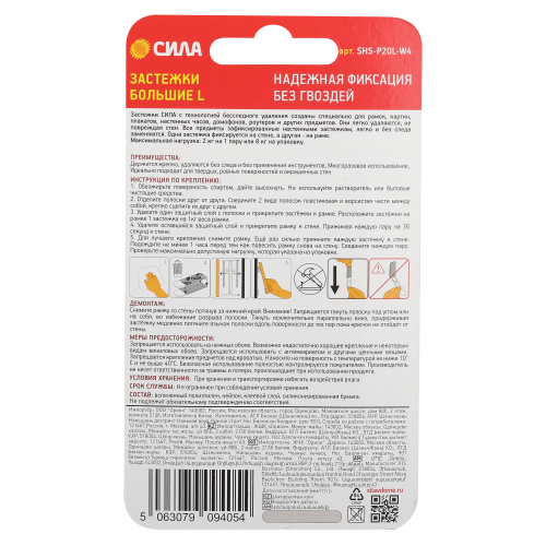 Застежки СИЛА с технологией бесследного удаления созданы специально для рамок, картин, плакатов, настенных часов, домофонов, роутеров и других предметов. Они легко удаляются, не повреждая стен. Все предметы зафиксированные настенными застежкам, легко и без следа заменяются. Одна застежка фиксируется на стене, а другая - на раме. Максимальная нагрузка: 2 кг на 1 пару или 8 кг на упаковку