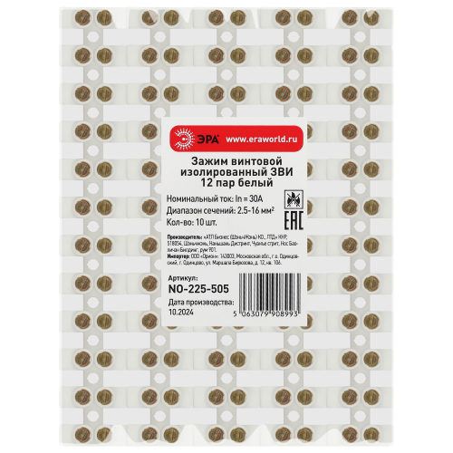 Зажимы винтовые изолированные ЗВИ-нг ЭРА представляют из себя контактную латунную колодку с зажимным винтом, заключенную в диэлектрический негорючий корпус и предназначены для создания проходного соединения всех типов проводников, защищая провод от повреждения и исключая возможность замыкания на корпус электроустановки. Применяются в распаячных коробках, для подключения осветительного и другого электрооборудования.