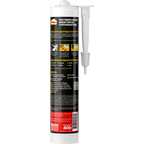Монтажный клей «Момент Монтаж Суперсильный Плюс» является высококачественным профессиональным монтажным клеем, разработанным специально для приклеивания и фиксации тяжелых конструкций. Специальная рецептура обеспечивает самую высокую первоначальную силу схватывания - 100 кг/м². Продукт идеально подходит для работ, где нужна повышенная прочность, установки подоконников, дверных рам, приклеивания стеновых панелей из дерева, ПВХ, пробки, изоляционных панелей. Цвет белый. Склеивает большинство материалов. Экологически чистый, без запаха.