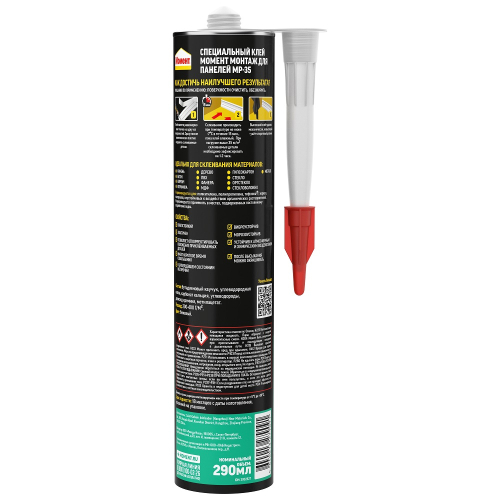 Область применения: для быстрого и прочного крепления панелей из различных материалов. Применяется для наружных и внутренних работ. Облицовочные работы. Установка изоляционных панелей. Крепление декоративных элементов. Основные преимущества: Устойчив к атмосферным и химическим воздействиям. Влагоустойчив. Эластичен. Виброустойчив. Позволяет откорректировать положение приклеиваемых деталей. Имеет короткое время схватывания. Можно окрашивать после отверждения. В затвердевшем состоянии не поддерживает горение. Морозоустойчив.