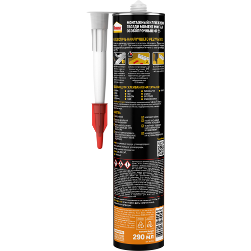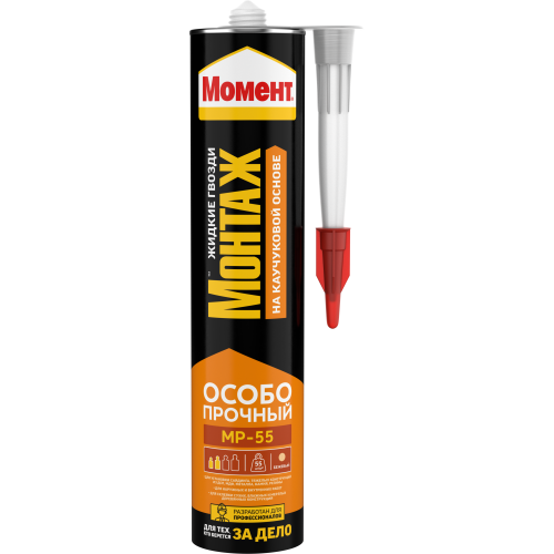 Монтажный клей Момент Монтаж Особопрочный МР-55 специально создан для применения во всех областях домашнего строительства и ремонта. Используется с большинством известных материалов. Высокая первоначальная сила склеивания - 55 кг/м2. Легкий в использовании и эксплуатации! Быстрое схватывание. Водостойкий. Обеспечивает хорошую адгезию с широким диапазоном строительных материалов. Компенсирует незначительные неровности поверхности при склеивании. Снижает звукопроницаемость. В неотверждённом состоянии легко удаляется. Не подходит для полиэтилена, полипропилена, тефлона, материалов, разрушаемых растворителем, входящим в состав клея.