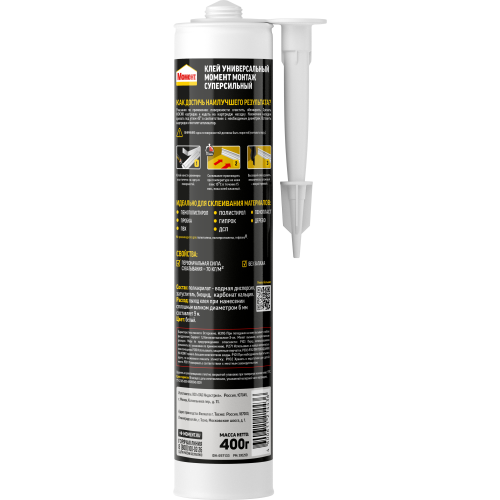 Является высококачественным клеем, разработанным специально для склеивания широкого спектра тяжелых конструкций внутри помещения. Клей МОНТАЖ суперсильный Момент 697133 используется, когда необходимо прочное склеивание. Подходит как для внутренних, так и наружных работ, заполняет трещины до 1 см. Данный клей не содержит растворителей и не имеет запаха. Хранить его необходимо при температуре не ниже 0 ºС. Соединяемые поверхности должны быть обезжиренными, и одна из них должна впитывать клей. Склеивание осуществляется при температуре от 10 ºС, в течение 15 минут. Не подходит для склеивания полиэтилена, полипропилена, тефлона и аналогичных материалов. Склеиваемые материалы: стиропор, дерево, металл, ПВХ, керамика, ДСП, гипсокартон, пробка, пенополистирол, гипс. Срок годности - 18 месяцев. Первоначальная сила схватывания — 70 кг/м2.
