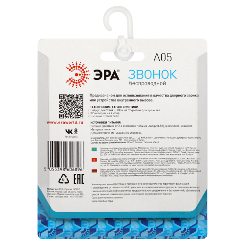 ЭРА А05 - универсальный аналоговый беспроводной дверной звонок в легком и прочном корпусе белого цвета. Наличие 38 встроенных полифонических мелодий даёт возможность выбирать звук звонка по душе. Если мелодия надоест - легко поменять на новую. Звонок придверный работает от 3 мизинчиковых батареек (3 х ААА). Стильный лаконичный корпус элегантно смотрится. Отличается упрощённой установкой - не нужно подключение к электросети. Кнопка звонка действует в радиусе 100 метров.